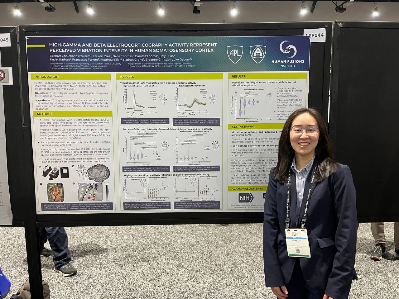 “The reception was very positive,” Chaichanasittikarn said of her presentation. “Several attendees asked insightful questions about the interpretation of the results from neuroscience, physiology, and engineering perspectives. Others were interested in the technical aspects, including the setup and how we decoded the vibrotactile information from ECoG signals.”