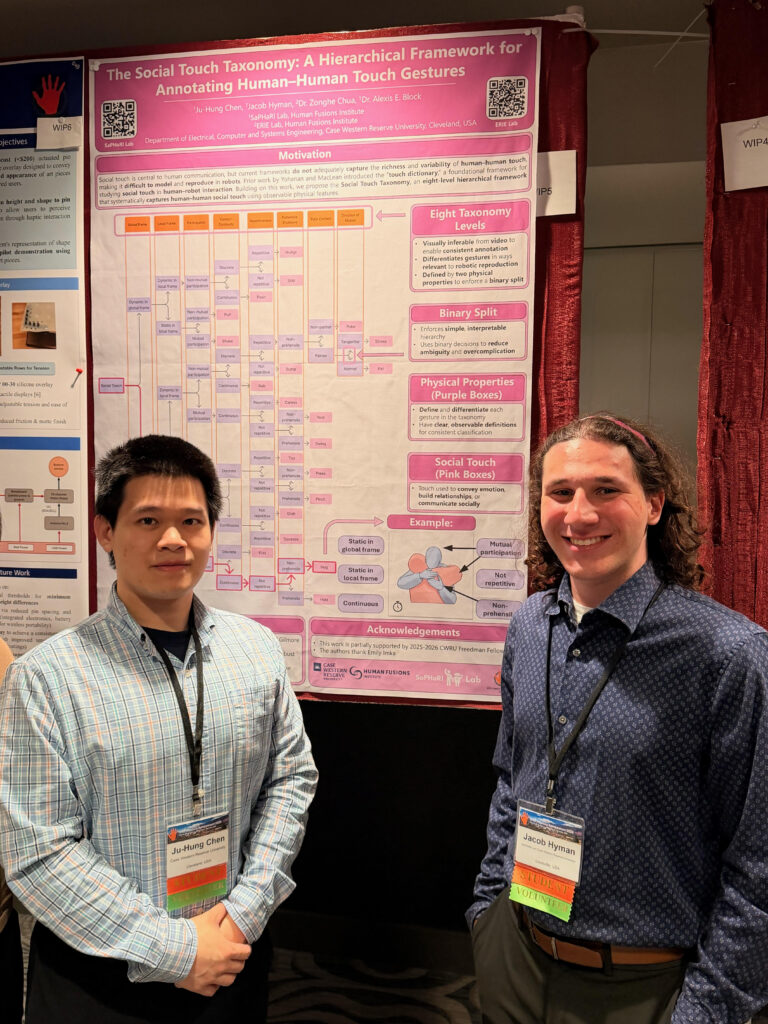 “I’m incredibly proud of Jacob and Ju-Hung for their work at the IEEE Haptics Symposium,” said Dr. Block. “Their social touch taxonomy addresses a fundamental gap in how we understand and design touch in human-robot interaction, and the strong engagement it received reflects the field’s need for this direction. It was especially exciting to present this as a collaboration with Dr. Chua, showcasing the kind of interdisciplinary work we’re building within HFI.”